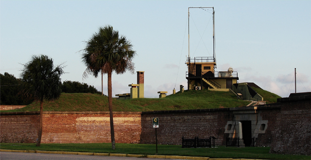 his image is from the front of Fort Moultrie. During the second world war this fort was standard along the shoreline near important harbors that need defending. During those days of heightened fear of an enemy that cruised just miles offshore, submerged in U-boats, wreaking havoc in the shipping lanes of the Atlantic Corridor, it was necessary to keep batteries fully armed with deadly howitzers: Below. image by Stan Deatherage