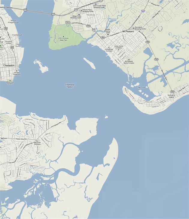 The most wonderful aspect of being stationed at Fort Moultrie is the beach: Above. This next image faces south and shows the thin tree line of the southern shore of Charleston Harbor: Below. images by Stan Deatherage