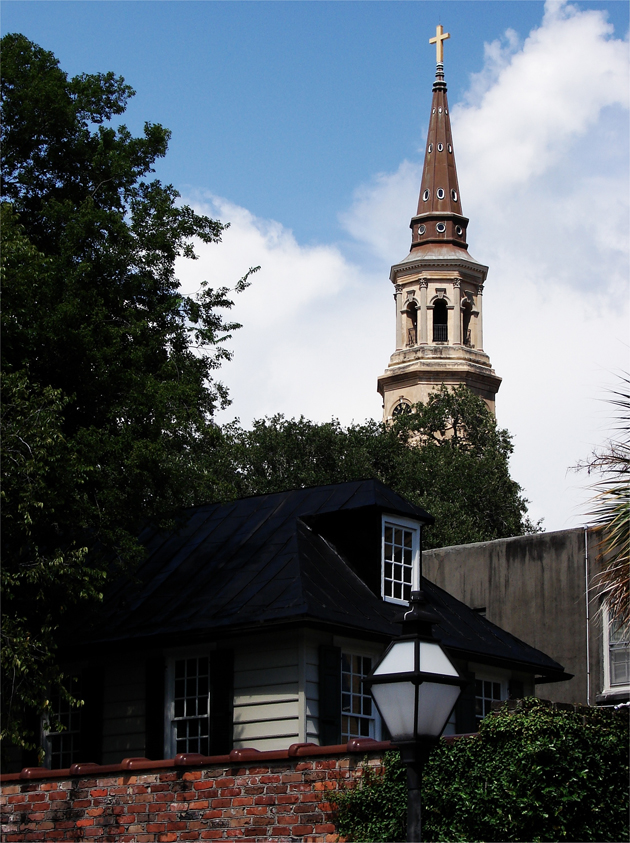 The view of Saint Phillips Episcopal Church's prominent spire can be seen from many vantage points in Charleston's Historic District. These two views are both from along Queen Street and gives the appearance that the spire is somehow built in the backyard of these Antebellum, Neo-Federal homes: Above and below. images by Stan Deatherage