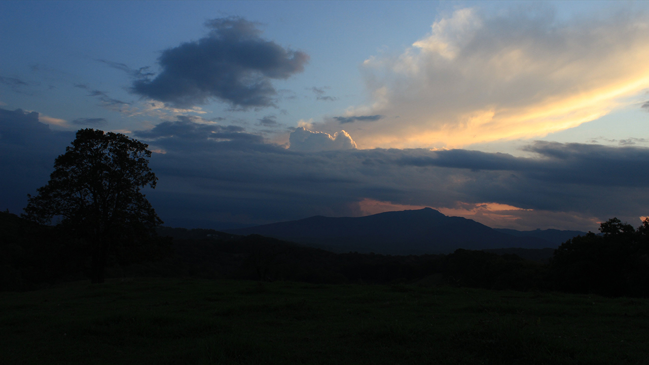 Here upon the hill usually occupied by painted cows at Moses Cone, we view this sunset, with Calloway Peak in the background: Above and below. photos by Stan DeatherageClick image to expand.