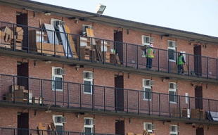Workmen remove materials in preparation for the demolition of Belk Residence Hall. (Photo by Cliff Hollis)