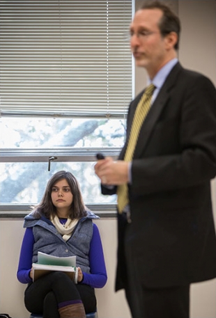 Embedded tutor Jennifer Violette listens in during a criminal justice class taught by ECU professor John Kerbs, standing. (Photo by Cliff Hollis)