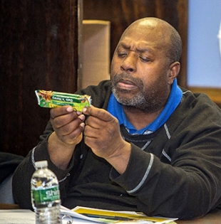 Leroy Smith, a participant in the monthly nutrition classes, studies the ingredients in a popular granola bar as part of class activities. (Photos by Cliff Hollis)