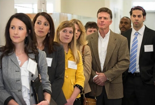 Listening intently during a tour of the new Lillington dental community service learning center are dental students Meagan Maida, 3rd year; Elizabeth Price, 2nd year; Caitlin Miller, 1st year; Caitlin's parents Gail and Vinnie Miller; N.C. Rep. Robert Reives; and 2nd year dental student Kevin Patel. (Photos by Cliff Hollis)