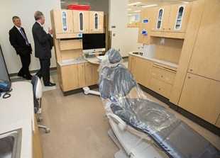 ECU Chancellor Steve Ballard, left, and Greg Chadwick, dean of the ECU School of Dental Medicine, tour the Lillington facilities on March 24, during a ribbon-cutting for the new community service learning center.
