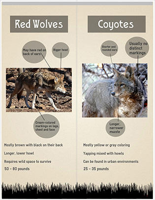 Five coastal North Carolina counties - Beaufort, Hyde, Dare, Tyrrell and Washington - make up the 1.7 million acres of the Red Wolf Recovery Area, the only place on Earth where red wolves still live. The animals - fewer than 100 remaining - share the land with hundreds of other mammals, including coyotes, which to an untrained eye look similar to red wolves.