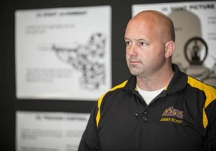 Master Sgt. Clint D. MacMiller, senior military instructor for ECU Army ROTC, observes ECU cadets as they train using the simulator.(Photos and video by Cliff Hollis)