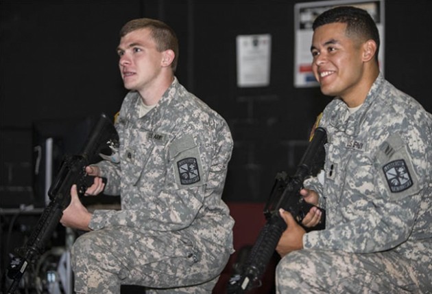 Recently, a "shoot, don't shoot" scenario unfolded before rising ECU seniors Andres Barrera and Joshua Charlton. The cadets were guarding a roadside checkpoint in the simulation when someone opened fire.