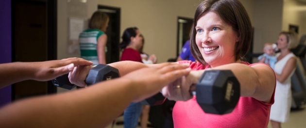 Kim Womack of Greenville uses free weights during an exercise session offered to women in their second and third trimesters as part of a study under way at ECU to assess how exercise during those months affects the health of the mother and baby. Womack is due in August. (Photos by Cliff Hollis)