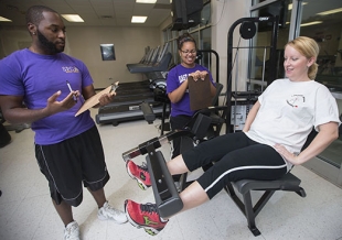 From left, Dominique Jones, who received his undergraduate degree in May and is now an exercise physiology graduate student, and Olivia Holden, a second-year graduate student in exercise physiology, oversee Beth Ketterman as she uses a leg resistance machine in ECU’s FITT building.