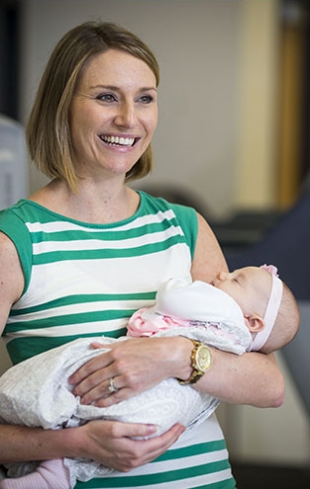Emily Brewer of Greenville holds her daughter, Elyza, who was born in April. Brewer has helped recruit other women for the study.