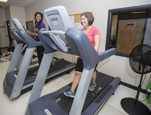Deandra Woods, an undergraduate exercise physiology student, walks on a treadmill beside Kim Womack, right, who is enrolled in the study.