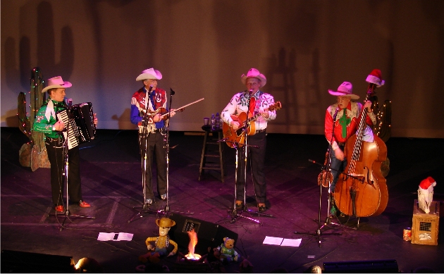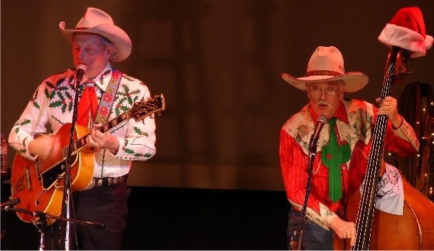 The band members were decked in their finest holiday attire; even Too Slim's standup bass had a Santa's cap atop its tuning fret. And that was their mission that night - To bring Christmas to the people of eastern North Carolina - "The Cowboy Way." Ranger Doug, from behind his Stromberg Jazz Guitar, bantered, "We've played over 5000 live performances, played the Grand Ole Opry nearly 700 times, won two Grammys, and we even had Saturday morning TV show, and now, at the apex of our illustrious careers, and we have finally made it to the top - we get to play the Turnage for all you fine folks. Now, we may could have made it here sooner, and to accomplish this, there may have been a easier way. But it wouldn't have been the cowboy way."
