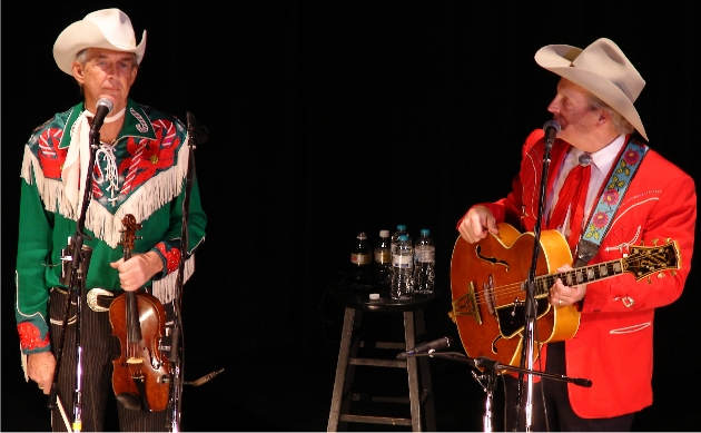 Riders in the Sky, from left to right: Joey the Cowpolka King, Woody Paul, Ranger Doug and Too Slim: Above. Ranger Doug and Too Slim harmonizing a wonderful cowboy melody: Below. photos by Stan Deatherage