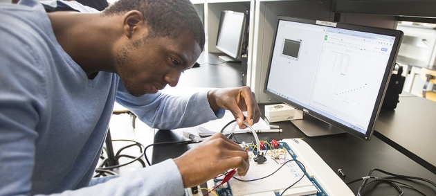 ECU senior Coriyon Arrington works in a biomedical instrumentation lab in the engineering department at East Carolina University. Created in response to regional industry needs for a skilled workforce, the department celebrates 10 years on Oct. 3. (Photo by Cliff Hollis)