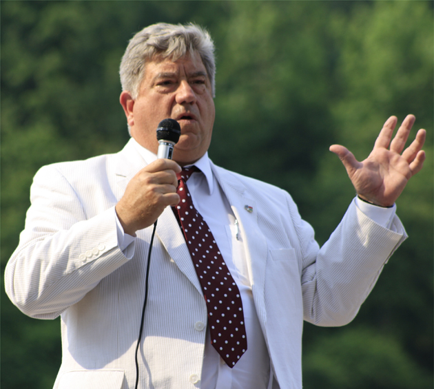 Representative Bill Cook explains the Republican position on the Voter ID and their other Conservative positions before a crowd of supporters at the Pat McCrory fundraiser, June 18, 2011. image by Stan Deatherage