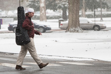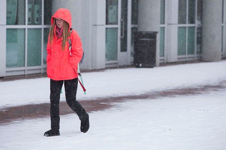 Students made their way to class on Feb. 24 as snow fell throughout the day, leading to cancellation of all classes after 3:30 p.m. (Photos by Cliff Hollis)