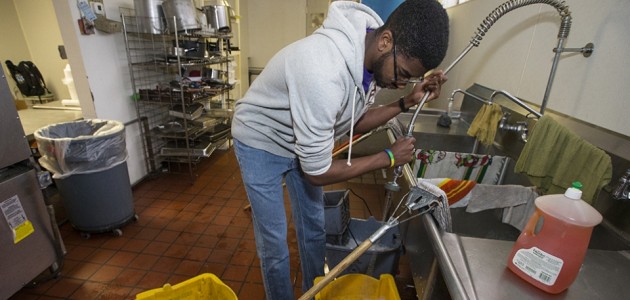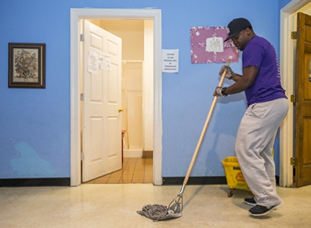 ECU freshman Roderick Hall prepares to clean floors at the Greenville Community Shelter, where he donated his time as part of the university's Alternative Break Experiences. (Photos by Cliff Hollis)