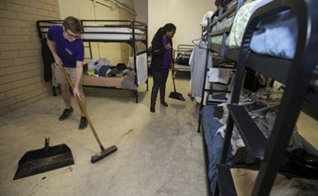 ECU students Kishan Darji, left, and Mary Crabtree work together to straighten up the sleeping area at the Greenville Community Shelter.