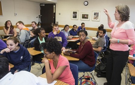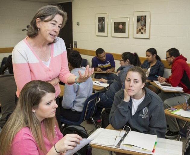 ECU biology professor Carol Goodwillie, standing, was honored by the UNC Board of Governors for excellence in teaching. Pictured above, she explains a concept to her students. (Photos by Cliff Hollis)