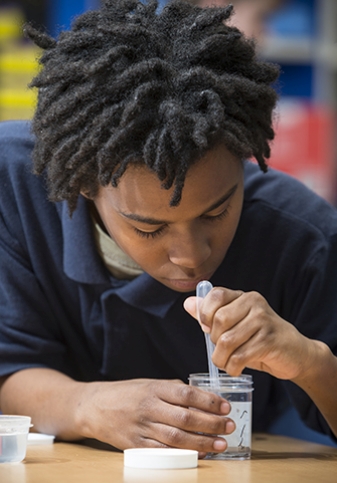 Riverside Middle School student T'san Griffin mixes ingredients for an experiment with flatworms.