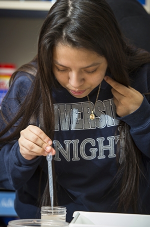 Middle school student Sandra Garcia fills photo trays with solution to acquire data on how flatworms respond to addictive substances.