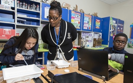 Tonya Little, center, Riverside Middle School's assistant principal, observes as Sandra Garcia, left, and Timothy Maxie, right, work on their flatworm experiments. Little is also the Martin County Schools STEM coordinator.