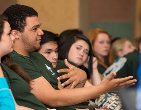 Brandon Standley, a student at Kinston High School, asks a question during a presentation by ECU professors Jamie DeWitt and Eban Bean.