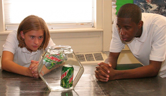 Middle schoolers observe as a sugar-free soda floats while the regular version sinks to the bottom. (Contributed photo)