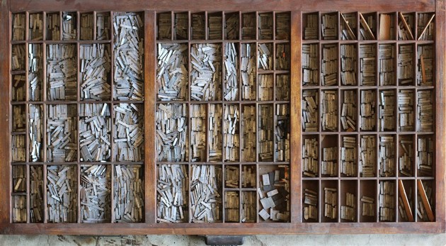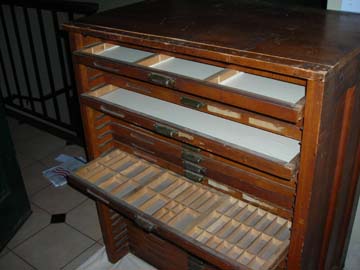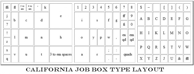 The first day of class, he handed out a sheet showing the arrangement of the type which was stored in a multi drawer roll around stand. Each drawer had a different font of type. The sheet was the layout of the type in the drawers.