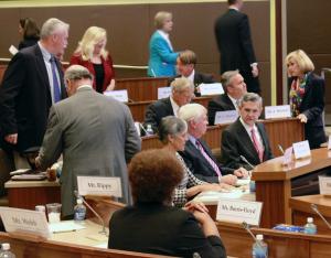 Members of the UNC Board of Governors gather at the Oct. 16 emergency meeting just before the board went into closed session. (CJ Photo by Kari Travis)