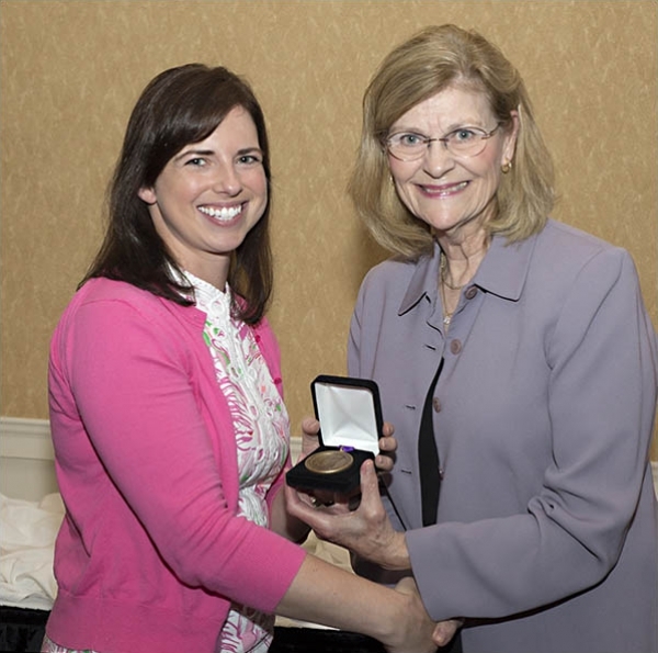 Vice Chancellor Phyllis Horns, right, congratulates Megan Inman of Laupus Library during an event honoring health sciences authors. (Photos by Gretchen Baugh)