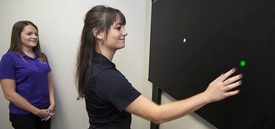ECU students Kalyn Kaminski, left, and Danica Motuz use the touchscreen board designed to help improve eye-hand-foot coordination by training users to respond effectively to multiple stimuli.