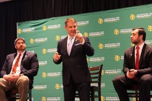 Rep. Mike Hager, R-Rutherford (at center), answers audience questions at a Thursday event sponsored by Americans for Prosperity. At left is Rep. Chris Millis, R-Pender, and at right is AFP-NC state director Donald Bryson.