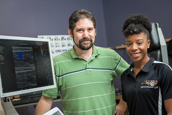 ECU student Erica Bell and Dr. Zac Domire work with a ultrasound device that helps with diabetic foot ulcer research.