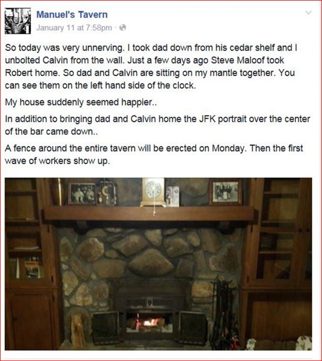 In February 2015, the announcement of the sale of the property caused a major firestorm in the community. The news media reported the sale but left the impression that the bar would be closing and the building renovated for venues that are more modern. Eventually, Brian posted on the face book page that the renovation was to upgrade the infrastructure of the building but Manuel's Tavern would reopen after the renovation. They even had photographers and historical committees come into document the bar and the artifacts. The expectation is that the after the building has been brought up to current standards with new plumbing, electrical and Air Conditioning they will reinstall the bar and all the old pictures.
