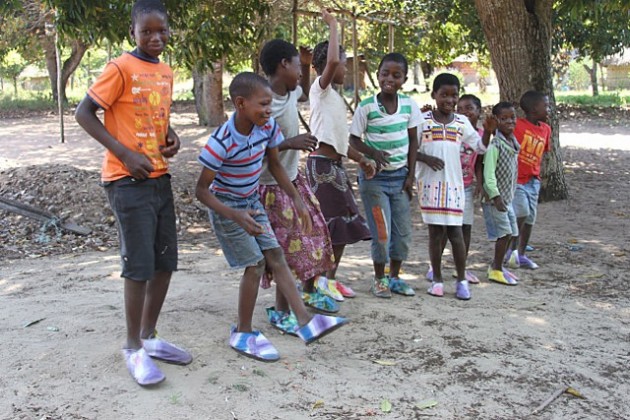 Children show off their new, hand-made shoes in a village in Mozambique.
