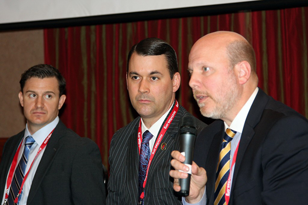 Lawson Bader, former president of the Competitive Enterprise Institute, at right, answers a question during a March 4 panel discussion about government forcing private organizations to release donor lists. Other panelists are attorney Jon Riches (left) and investment manager Ted Hicks. (CJ Photo by Dan Way)