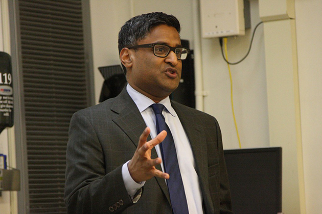 Ramesh Ponnuru, National Review senior editor and American Enterprise Institute fellow, talks to students about free expression at a Wednesay speech at Duke University. (CJ photo by Dan Way)