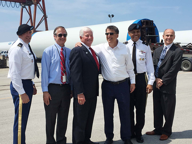 From left to right: Colonel Kevin Landers (Commander, Wilmington District, Army Corps of Engineers), Nick Tennyson (NCDOT Secretary), Tom Adams (Chairman, NC State Port Authority Board of Directors), Governor Pat McCrory, Brigadier General David Turner (Commander, Army Corps of Engineers), Paul Cozza, (CEO, NC State Port Authority)