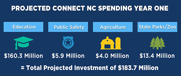 Agriculture and consumers will also benefit from Connect NC. Approximately $94 million will be spent to construct a new Agriculture and Consumer Sciences Lab for veterinary, food, drug and motor fuel testing. An additional $85 million will go toward a new Plant Sciences Research Complex at NC State University.