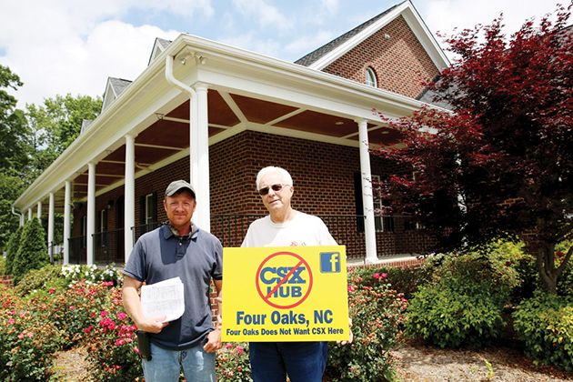 Pictured outside his home near Four Oaks, Randy Johnson, left, opposes a CSX project that would take his home and his family's farmland. Pharmacist Jack Austin, right, is concerned about air pollution from additional diesel engines. (CJ photo by Don Carrington)