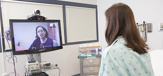 With the use of telepsychiatry, Brody School of Medicine psychiatrists like Dr. Toni Johnson (on screen) can connect with patients in hospital emergency departments statewide. (Photos by Cliff Hollis)