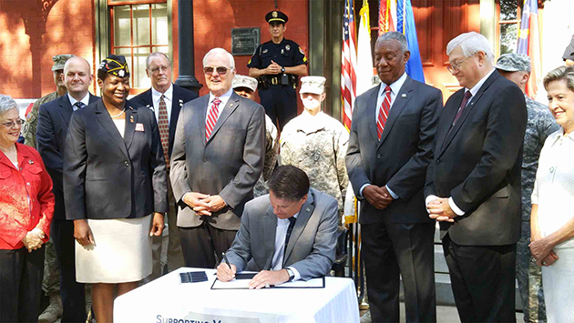 Raleigh, N.C.     Governor Pat McCrory was joined by veterans, active duty military members and legislators at the Department of Military and Veterans Affairs today as he signed legislation to support veterans in North Carolina.