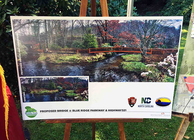 Designed to be made of laminate wood with a stone fascia, the bridge will meet standards set by the National Park Service and Blue Ridge Parkway. Construction will begin once other funding is finalized for a 1.3-mile stretch of the greenway that includes the bridge. With landscaping enhancements already growing in the median along U.S. 321 by the parkway, the bridge will fit naturally into the setting and immediately become an iconic structure of the Middle Fork Greenway.