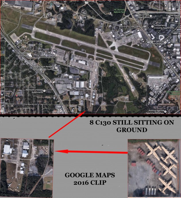 Here is a Google map view of the Base in Marietta showing the planes still sitting in the storage area not far from the runway with inset of the planes and the spare parts containers.
