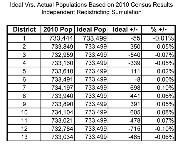 The ideal congressional district population, based on the 2010 Census, is 733,499. All 13 of the districts drawn by the panel show some deviation from that figure, ranging from eight people to 715 (see chart).