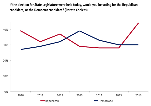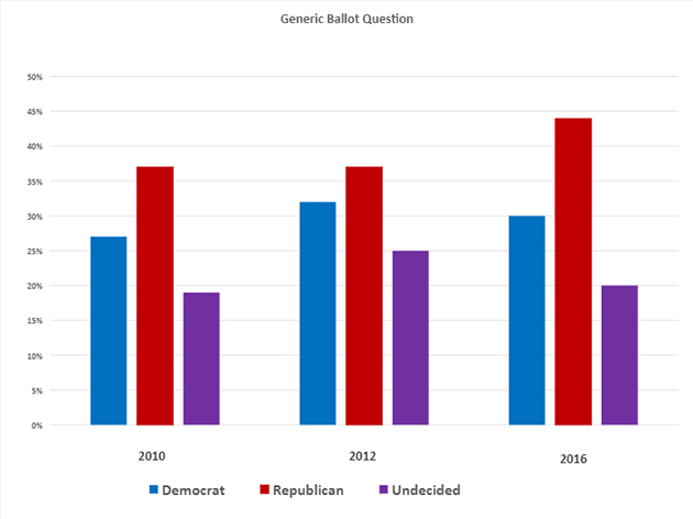 One of the best measures to determine what is happening with the voters is to look at what is known as a "generic ballot" question. Here is a look at the generic ballot question beginning in 2010, the year we conducted our first unaffiliated poll, and a close-up look at 2012 and 2016.