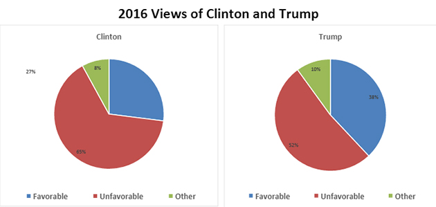 The baseline for the presidential election is basically the same (with two very different major-party candidates this year). Both candidates are universally known and voters have strong, even if more negative, views of Hillary Clinton and Donald Trump. In a reversal from 2012, the Democratic candidate is seen in a less favorable light than the Republican candidate.