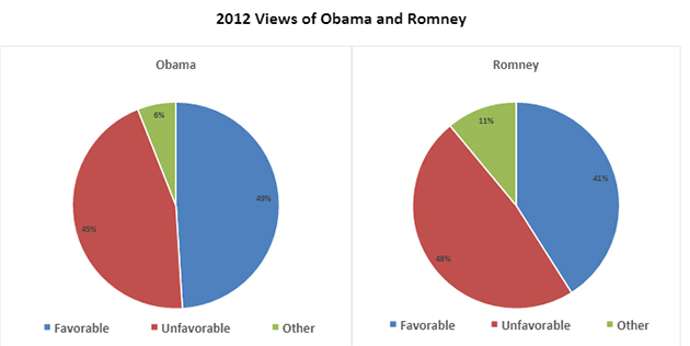 The 2012 numbers below show Obama with a net favorability of plus-4 percent, compared to Clinton's 2016 net favorability of minus 38 percent. Romney had a net favorability of minus-7 percent, which compares to Trumps net favorability of minus-14 percent. So while both candidates are much worse off than the respective 2012 candidates, Trump is in far better position relative to Clinton than Romney was to Obama. Trump's favorability numbers are within the margin of error of where Romney was in 2012. Clinton, on the other hand, is clearly in a worse position with these voters than Obama was in 2012.